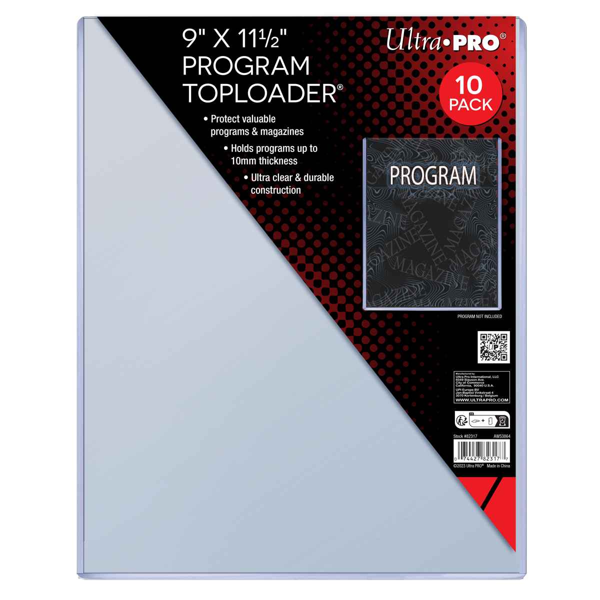 9" x 11-1/2" (228.6 mm x 292.1 mm) 10 mm Thick Program Toploaders. Keep extra-thick programs and other collectibles clean, recyclable. 10 Toploaders per pack.