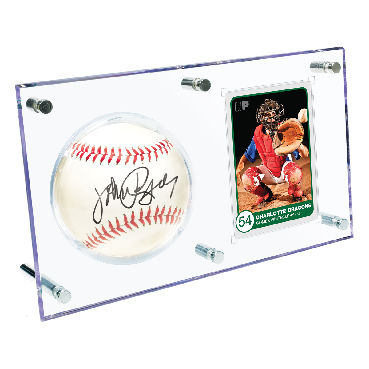 - Safely stores and displays 1 baseball & 1 standard size trading card
